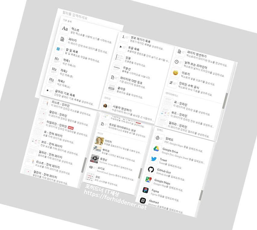 단순한 메모 프로그램에서 사용할 수 없는 정말 많은 필터기능들을 사용할 수가 있습니다. (텍스트, 페이지, 할 일 목록, 제목1, 2, 3, 글머리 기호 목록, 번호 매기기 목록, 인용, 구분선, 페이지에 대한 링크, 콜아웃, 사용자 멘션하기, 페이지 멘션하기, 날짜 또는 리마인더, 이모지, 인라인 수학 공식, 표- 인라인, 보드 - 인라인, 갤러리 -인라인, 리스트, 캘린더, 타임라인, 이미지, 북마크, 동영상, 오디오, 코드, 임베드, Google Drive, Twitter, GitHub Gist, Google Maps, Figma, Abstract)