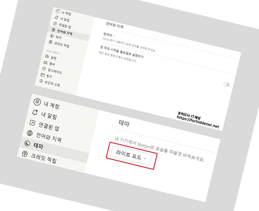 [언어와 지역] 에서는 한국어 - 영어 - 일본어 - 중국어 등으로 변경을 할 수 있고, 한 주의 시작을 월요일로 설정하기를 할 수 있고, 테마에서는? 라이트 모드, 다크 모드 설정을 할 수 있습니다.