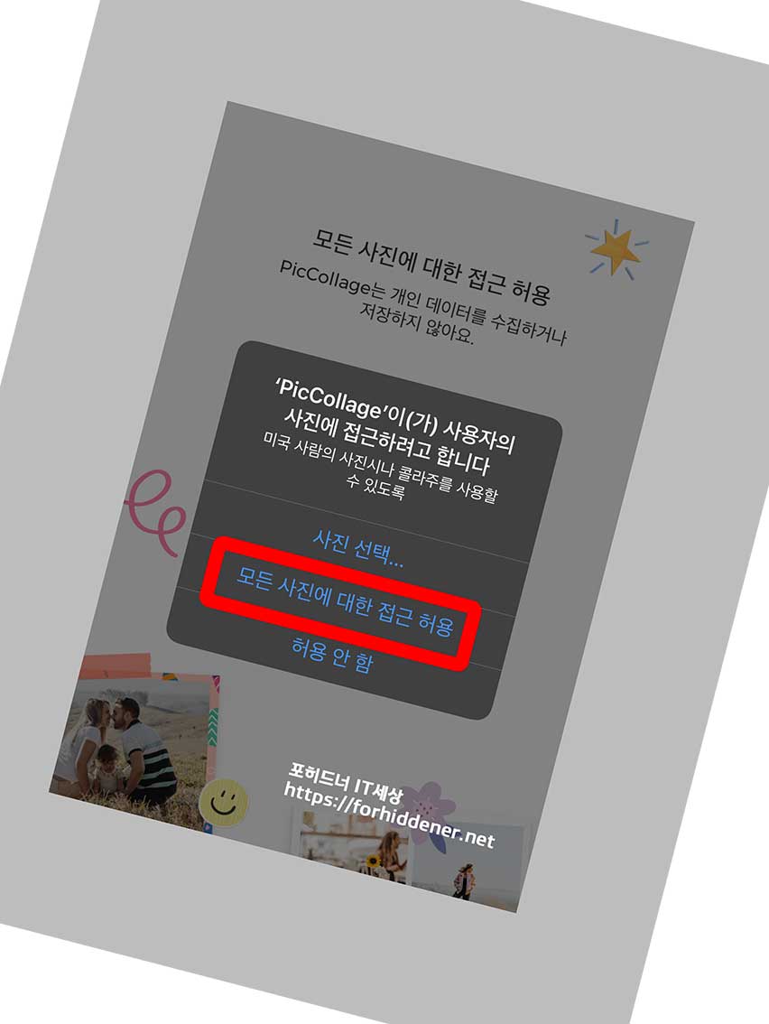 app을 사용하기 전에 먼저 위와 같이 사용자의 사 진 에 접근하려고 합니다. 메시지가 뜨면? '모든 사진에 대한 접근 허용'을 수락합니다.