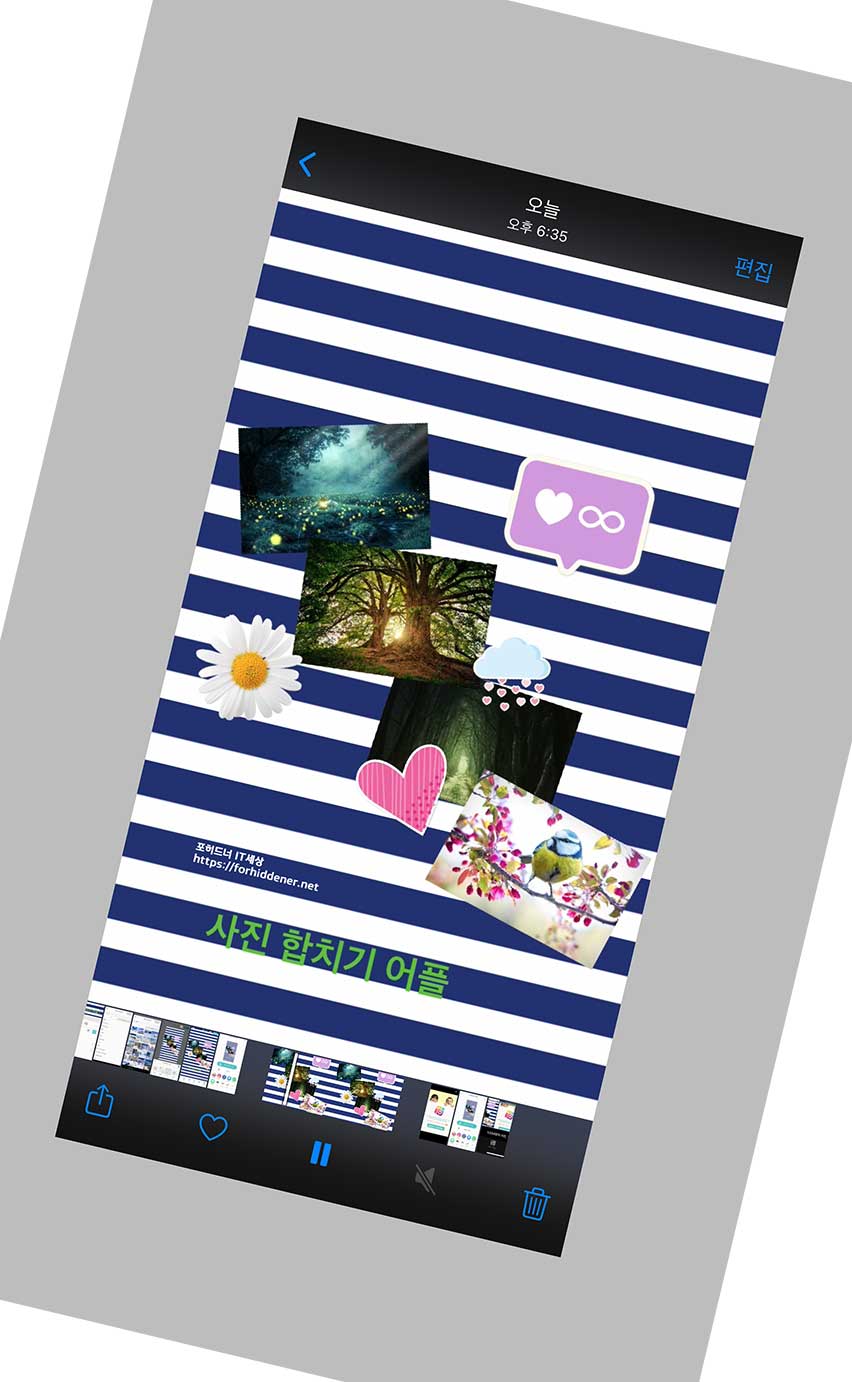 결과물 이미지 입니다. image 파일이 아니라 동영상으로 저장이 된 이유는? 애니메이션 효과를 넣었기 때문입니다. 애니메이션 효과를 넣지 않고 저장을 하게되면 일반 image 파일로 저장이 되니, 이용에 참고를 해주시면 좋을것 같습니다. 배경, 프레임, 스티커, 문자 등을 적절히 넣어 나만의 개성있는 예쁜 콜라주 작품을 만들 수 있습니다. 이상 지금까지 "사진 합치기 어플" 콜라주 앱 사용법에 대해 배워봤는데요~ 오늘 내용 도움이 되셨나요? 글을 끝까지 읽어주셔서 감사합니다.