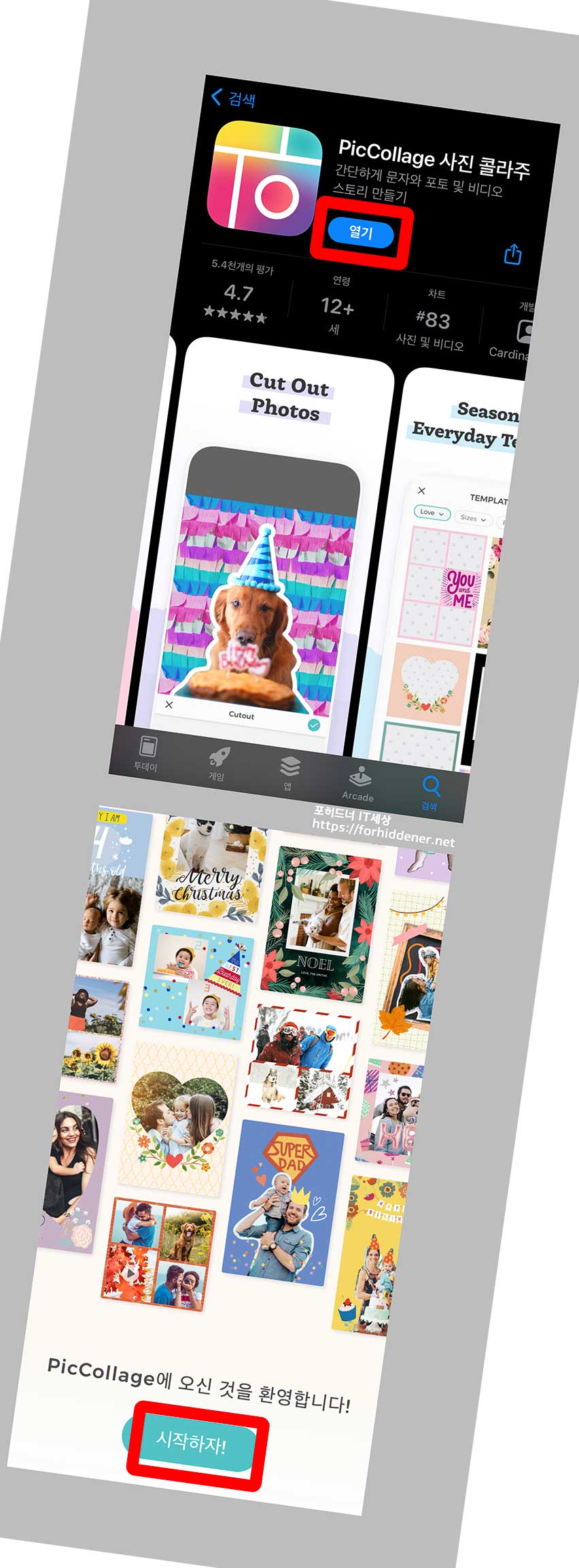 사진 합치기 어플 - 이름은? PickCollage 픽콜라주 라는 애플리케이션 입니다. [받기] , [설치] 후 열기를 누르면? 시작하는 환영 화면이 나올 것입니다. '시작하자!'를 Click 합니다.