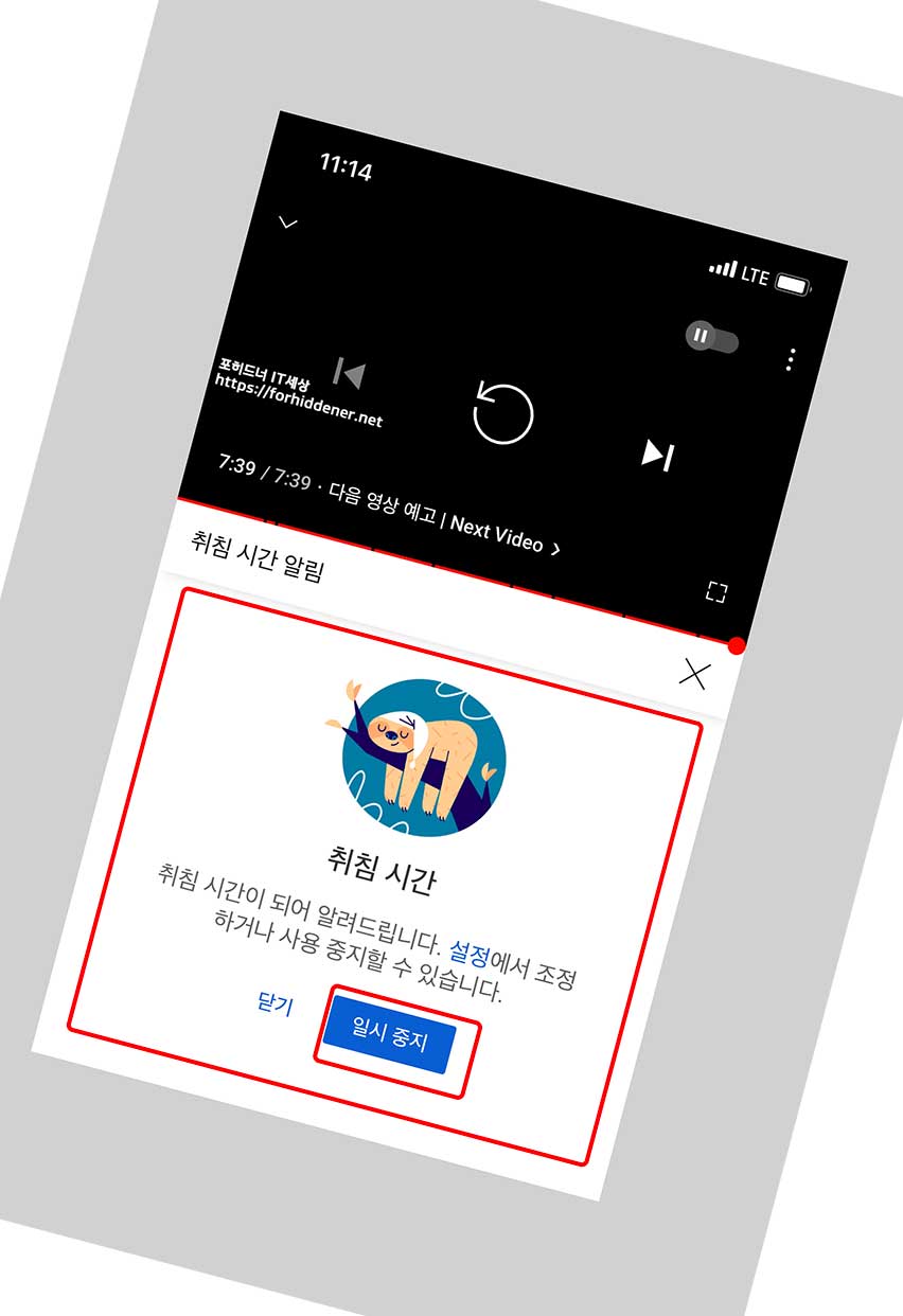 위와 같이 YouTube 동영상을 시청하고 계시다가 유튜브 자동종료 시간설정 한 시점이 되면 아래와 같이