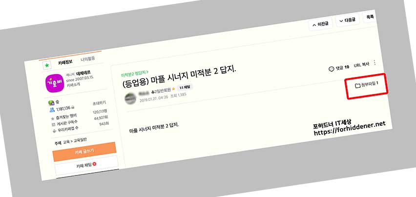 왼쪽에 카페 글쓰기로 문구가 바뀌었을 것이고, 사진과 같이 자료를 내려받을 수 있는 게시물이 보일 것입니다. 마플 시너지 미적분 답지 를 내려받기 위해서는? [첨부파일]을 클릭합니다.