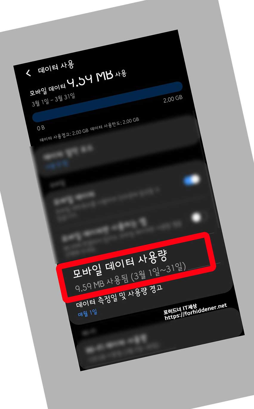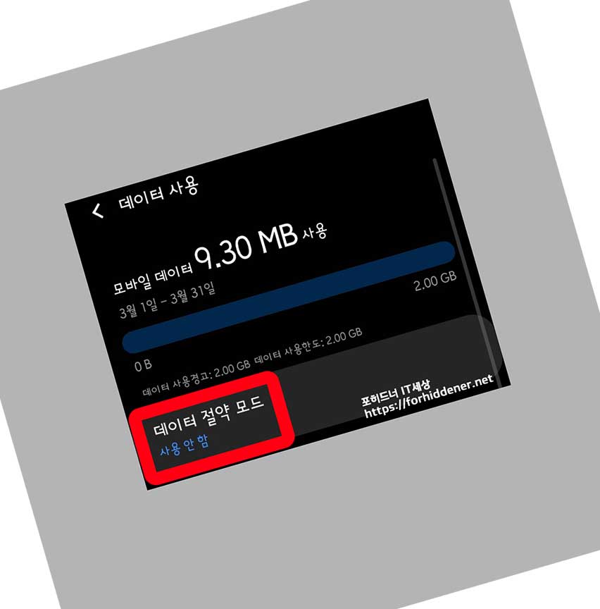'데 이 터 사용' 항목에 들어갑니다. 그러면? 위와 같이 이번달 3월 1일 ~ 3월 31일까지 사용한 Data 량이 나옵니다. 9.30 MB를 사용한 것으로 나옵니다. 저는 와이파이 Wi-Fi 환경에서만 연결해서 사용을 했기 때문에 그렇습니다. 현재 데이터 절약 모드 에는 '사용 안 함' 으로 나오는데요~ 손가락으로 Touch 를 하면?