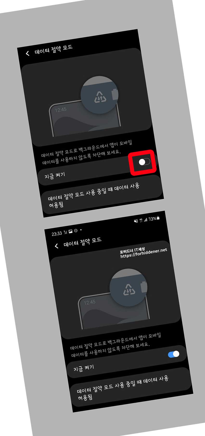 Data 절약 모드로 백그라운드에서 실행되고 있는 앱이 모바일 Data 를 사용하지 않게 차단을 할 수 있는 기능입니다. 한두번 실행을 시키고 멀티태스킹으로 다른 앱을 열어서 사용을 할때 해당이 되는 내용인데요~ 다수의 앱을 백그라운드에서 실행을 시켜놓으면 불필요하게 Data를 사용하기도 합니다. 네트워크 통신 환경이 좋지 않은 곳에서는 더 소모를 할 수도 있기 때문에 이 기능을 활성화 시켜두시면 불필요한 데이터를 절약 하실 수 있습니다. 설정하는 방법은? 아주 간단합니다. 지금 켜기에서 동그라미 버튼을 오른쪽으로 이동시키면 파란불이 켜지고 기능이 활성화가 됩니다. 해제 하는 방법은? 반대로 해주시면 되겠습니다.