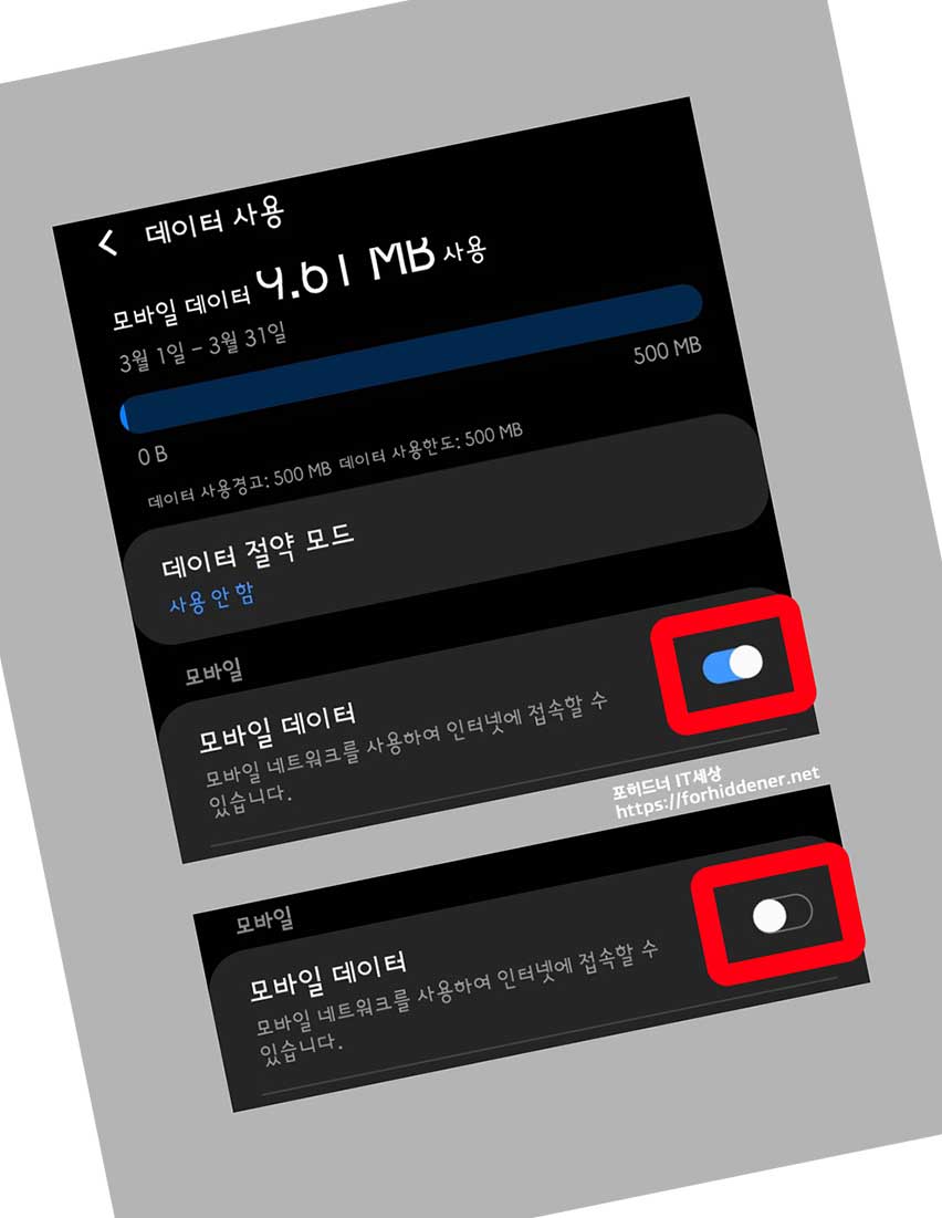 스크린샷과 같이 '모바일 데 이 터' 라고 현재 파란불 동그라미 버튼의 위치는 오른쪽에 위치해있어 활성화가 되어있을 탠데요~ 만약 두번째 첨부한 스크린샷과 같이 동그라미 위치를 왼쪽으로 이동을 시켜 기능을 비활성화 시키게되면? internet 사용이 불가능해집니다. 갤럭시 데이터 차단 을 하는 또다른 방법입니다.