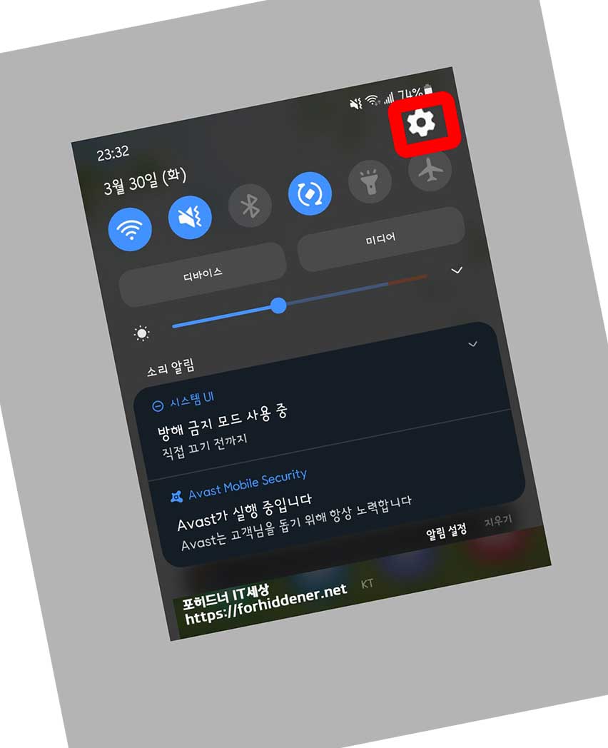 설정에 들어가야 합니다. 홈 화면에서 톱니바퀴 아이콘을 클릭하거나 빠른설정창에서 우측 상단 톱니바퀴 아이콘을 눌러 설정 환경에 들어갑니다.