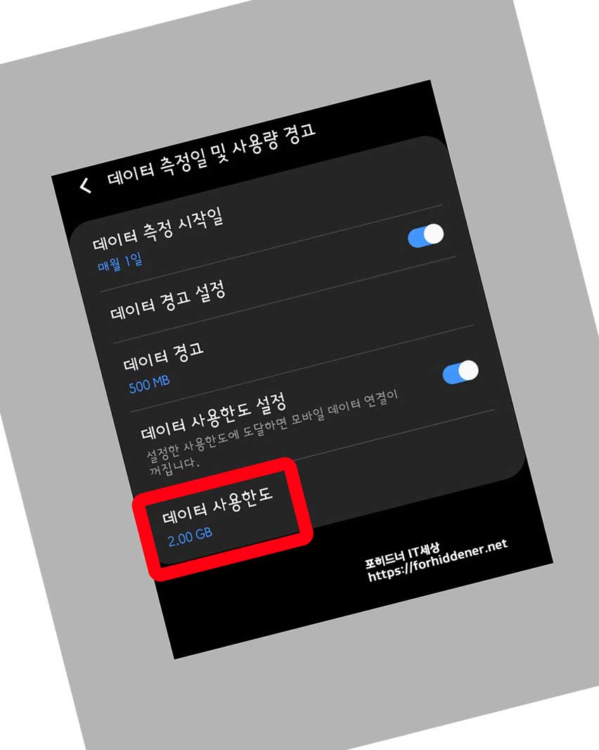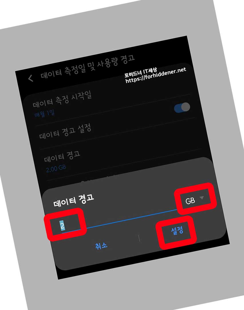 기본 숫자가 적혀있을 것입니다. 저의 경우에는 2GB 로 되어있지만 사용중인 요금제는 500MB 월 기본제공해주는 서비스를 사용하고 있기 때문에 GB를 손가락으로 터치해서 MB로 바꿔줘야 합니다. 왼쪽에 숫자도 500으로 해주시면 되겠습니다. 500MB 가 되었다면? '설정'을 누릅니다.