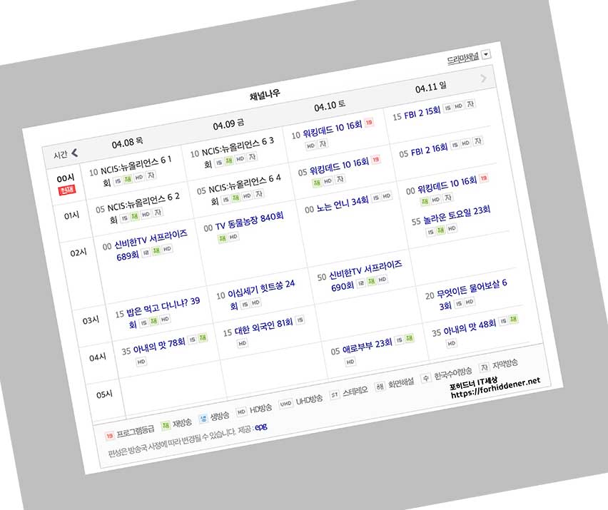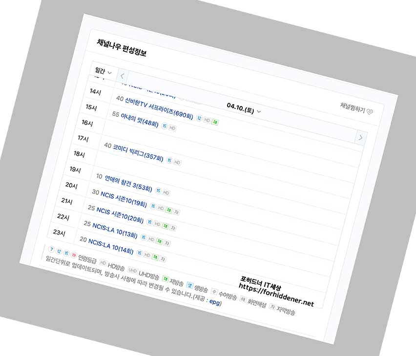 위와 같은 결과가 나옵니다. 방송 시간표를 봤더니 > 를 클릭하면 04월 10일(토요일)까지 시간표가 나옵니다.