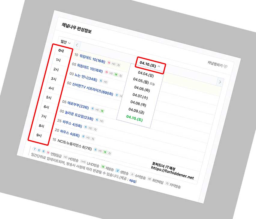 위와 같은 결과가 나옵니다. 방송 시간표를 봤더니 > 를 클릭하면 04월 10일(토요일)까지 시간표가 나옵니다.