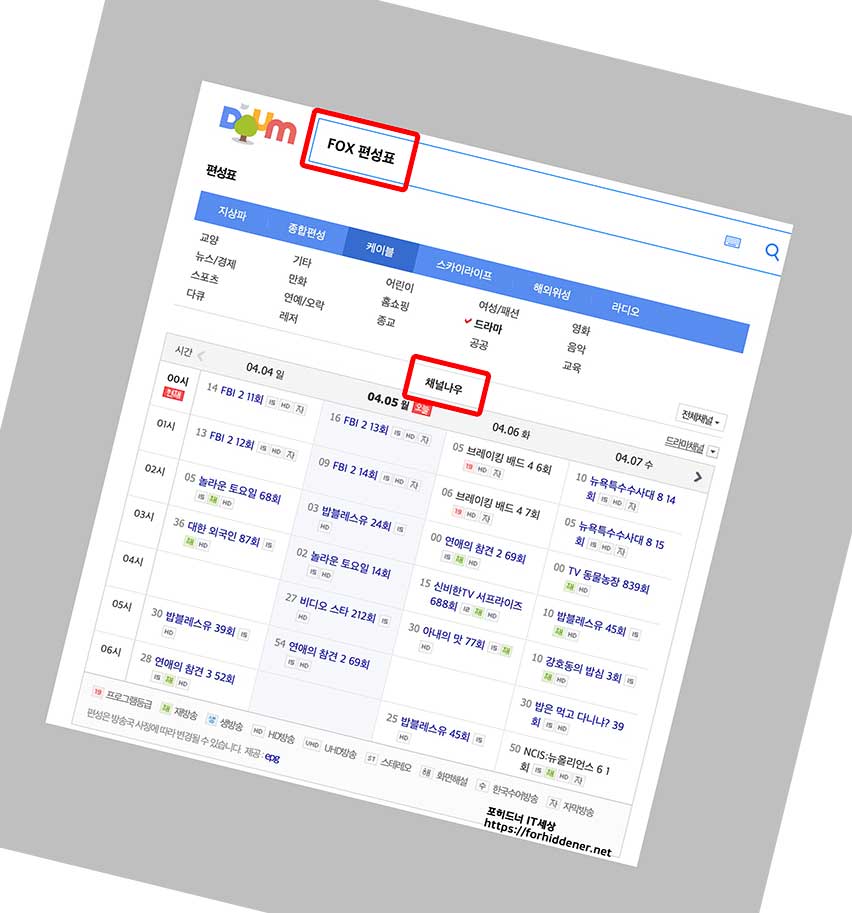 Daum 또는 Naver 에서 첨부한 스크린샷과 같이 'FOX 편성표' 라고 검색을 하시면 케이블 -> 드라마 -> 채널나우 편성표 정보를 볼 수 있습니다. (구) 폭스 채널 입니다. 다음 포털에서 검색을 하면? 어제 날짜부터 04월 11일 까지 날짜가 나옵니다.