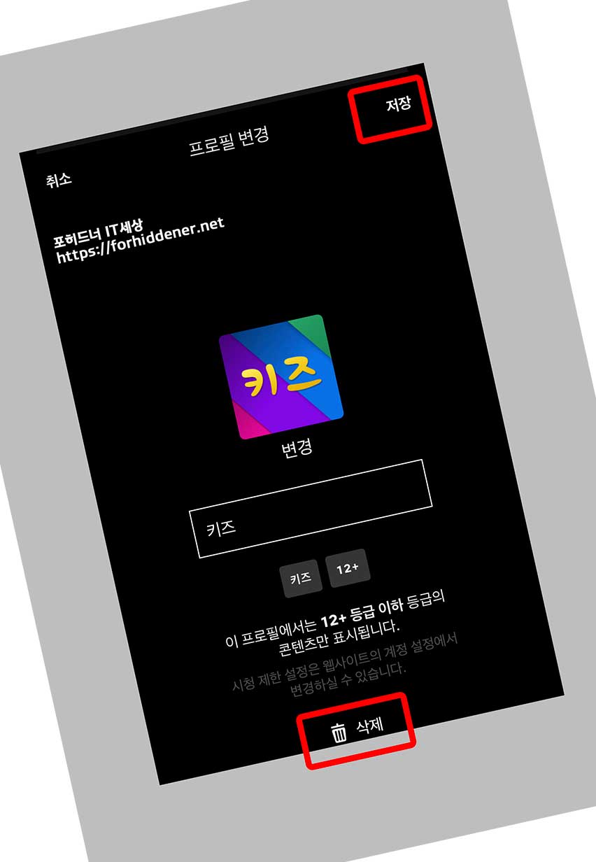 키즈는? 12+ 등급 이하 등급의 콘텐츠만 표시가 되는 것이 특징입니다. 자녀들용 으로 만들어두셨는데, 자녀가 없으시다면? 휴지통 모양 '삭제'를 눌러 지우기를 할 수가 있습니다. 키즈는 기본에 해당이 되지 않기 때문에 사용자가 원한다면 추가로 다른 Profile을 만들지 않아도 제거가 가능합니다.