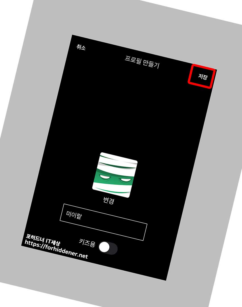 지정을 하지 않으면 일반(성인)으로 되고요, 지정을 하면? 키즈용(어린이용)으로 만들 수 있습니다. 저장을 누릅니다.