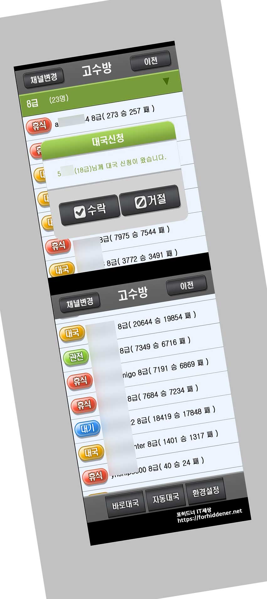 바로 대국신청이 옵니다. 이때 (수락, 거절)을 할 수 있습니다. 또한 현재 방의 상태를 확인할 수가 있는데 (대국, 관전, 휴식, 대기) 로 색상으로 경기중인지, 쉬는중인지, 대기방인지 확인할 수 있습니다.