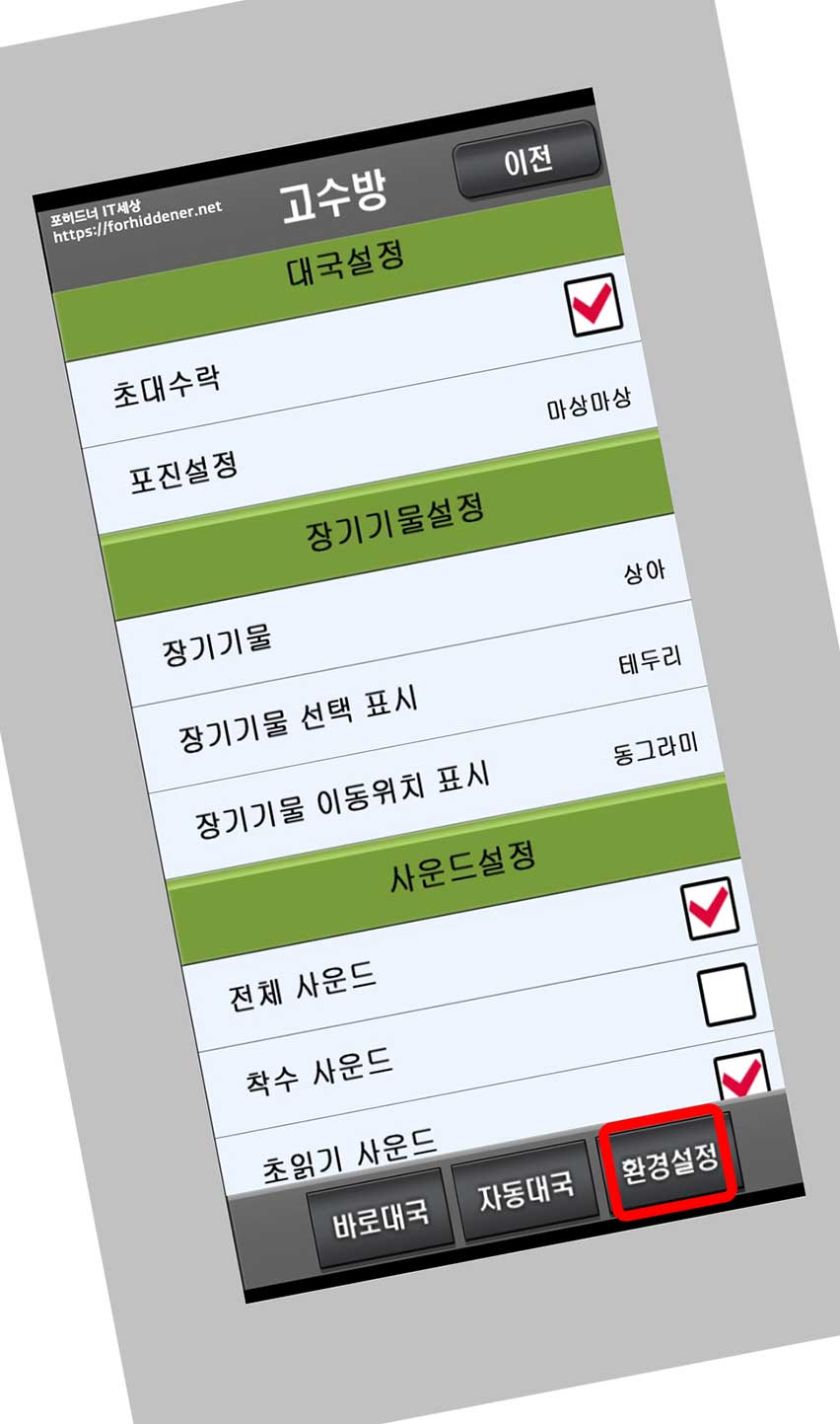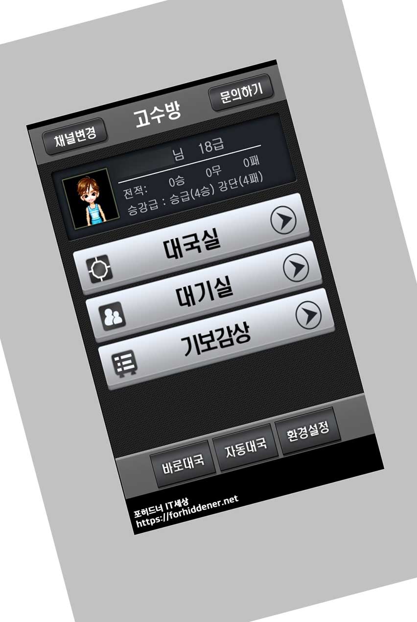 대국실에 입장을 하기 전이고, 대기실, 기보감상, 바로대국, 자동대국, 환경설정, 채널변경 등 메뉴가 있습니다. 환경설정에 들어가면?