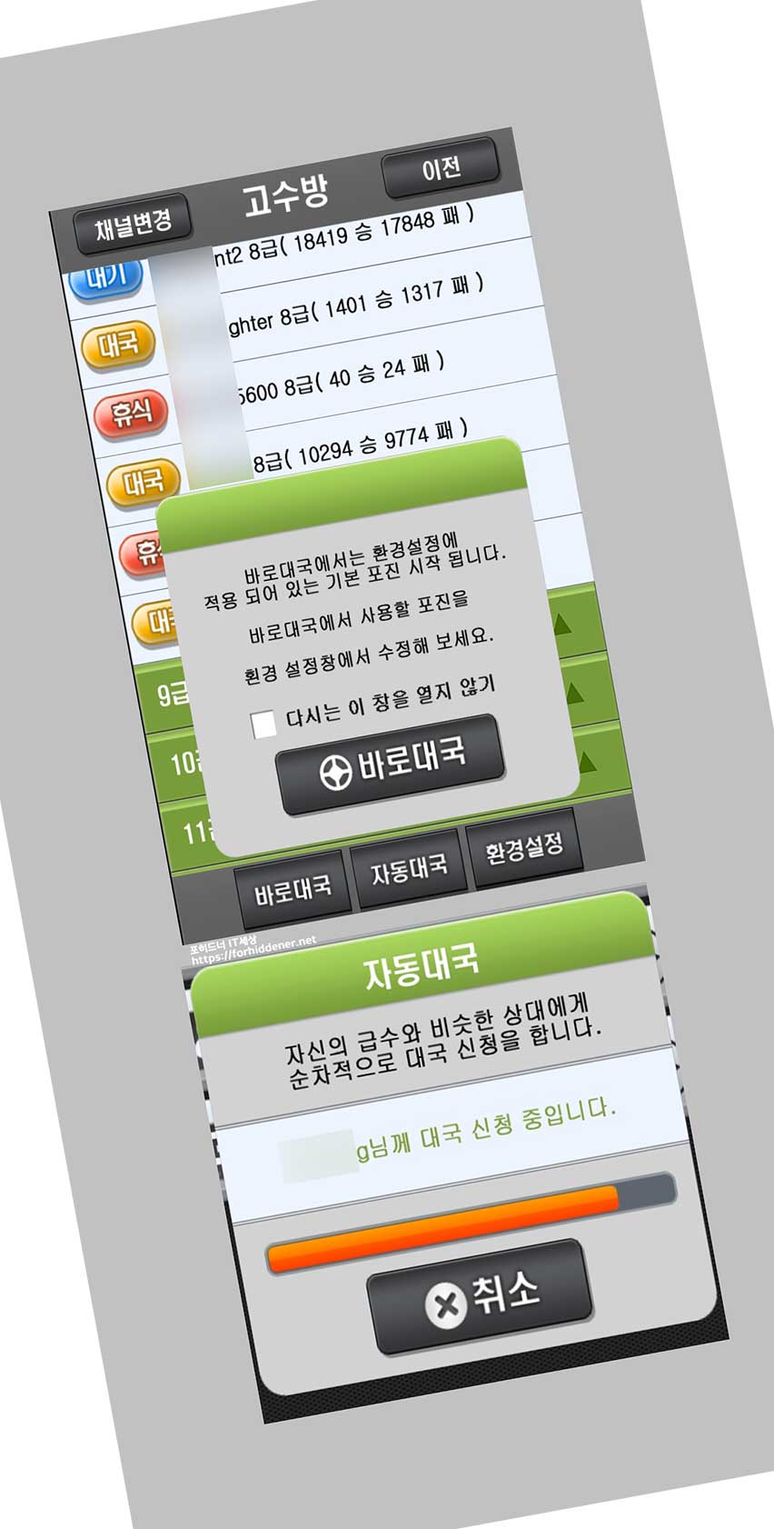 환경설정에서 적용 되어 있는 기본 포진으로 시작하는것이 특징입니다. 자동 대 국은? 자신의 급수와 비슷한 상대에게 순차적으로 자동으로 대 국을 신청합니다. 아까전에 저에게 날라온 대 국 신 청 메시지가 바로 (자동 대 국)입니다.
