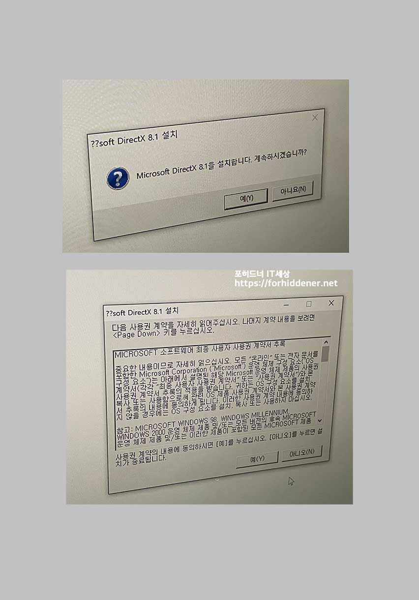 위에 스크린샷과 같이 Microsoft DirectX 8.1 을 설치합니다. 문구가 뜨면서 굉장히 오래된 다이렉트 x 8.1 프로그램을 install 하는 마법사가 뜹니다. 예를 눌러 시도를 하더라도 Error가 뜹니다. 결론은 Windows 10 운영체제에서는 어떻게든 PC 환경에서 일반적인 방법으로는 안되는것 같습니다.