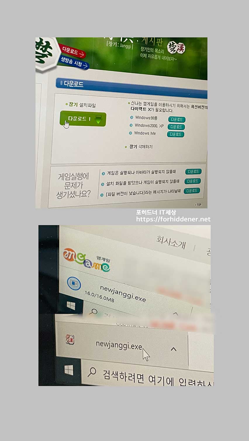 왠지 다운로드 버튼을 클릭하면? 파일을 인스톨하고 엠게임장기 를 할 수 있을것 같지만, 옆에 설명을 보면? 낯익지 않은 아주 오래된 운영체제 버전이 보입니다. Windows 95용, Windows 2000, XP, Windows Me 다운로드 버튼이 보이는데, 왼쪽 초록색 버튼이 최신버전으로 보여 클릭을 했습니다. newjanggi.exe 파일을 내려받을 수 있는데, 마우스로 클릭을 하면?