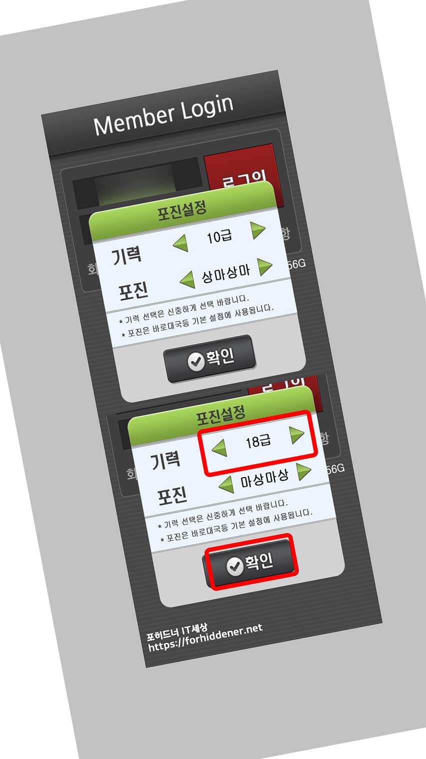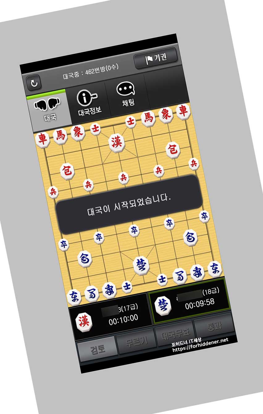 바둑처럼 기력을 선택해야하는데~ 처음 하시는분들은 기본은 10급으로 자동설정이 되어있지만, < 버튼을 눌러 18급으로 내려서 하시는것을 권해드립니다. 포진은 (상마상마, 마상마상)이 있습니다. 두번째 첨부한 스크린샷과 같이 설정 후 확인을 누릅니다.