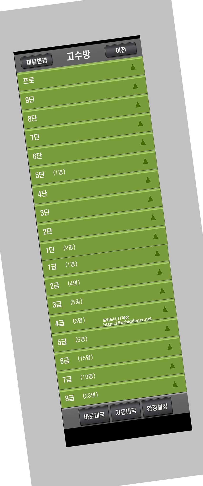 (프로, 9단, 8단, 7단, 6단, 5단, 4단, 3단, 2단, 1단, 1급, 2급, 3급, 4~8급) 채널이 있습니다. 옆에 (가로 숫자)는 현재 해당 채널의 접속인원 입니다.