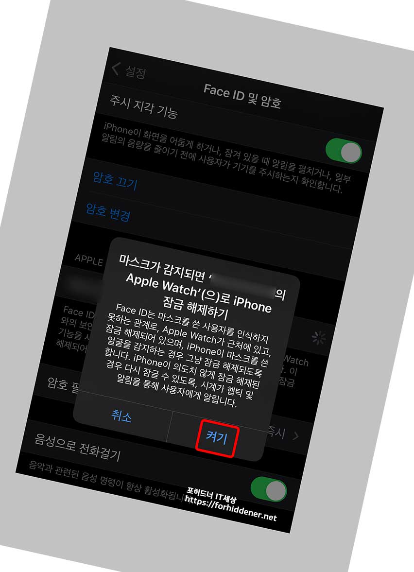 동그라미 위치를 오른쪽으로 이동을 시키면? 기능을 '활성화' 시킬 수 있습니다. 활성화 시키면? 첨부한 스크린샷 이미지와 같이 마스크가 감지되면 사용자의 apple Watch (으)로 iPhone 잠금 해제하기 를 한다고 안내문구가 나옵니다. 먼 거리에서는 암호를 풀 수 없고, 2m , 2미터의 거리에서 인식할 수 있다고 합니다. 설명 내용을 읽어보면? iPhone이 마스크를 쓴 얼굴을 감지하는 경우 그냥 잠금 해제되도록 합니다. iPhone이 의도치 않게 잠금 해제된 경우 다시 잠글 수 있도록, 시계가 햅틱 및 알림을 통해 사용자에게 알린다고 나와있습니다. 기능을 활성화 하려면? [켜기]를 누릅니다.