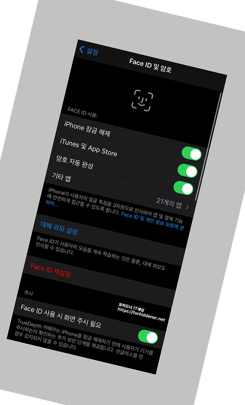 페이스 아이디 설정에서 손가락을 이용해 아래로 스크롤을 내리면