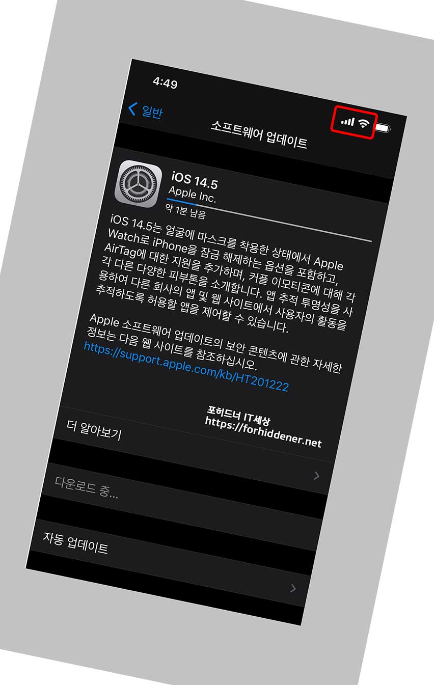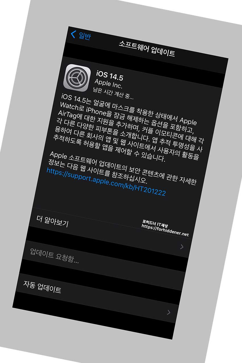 새로운 소프트웨어인 iOS 14.5 를 설치하기 까지 소요되는 시간은? 대략 15~30분 정도 소요가 되는것 같습니다. iPhone 기기에서만 업데이트를 진행하면 해당 기능을 사용할 수가 없고
